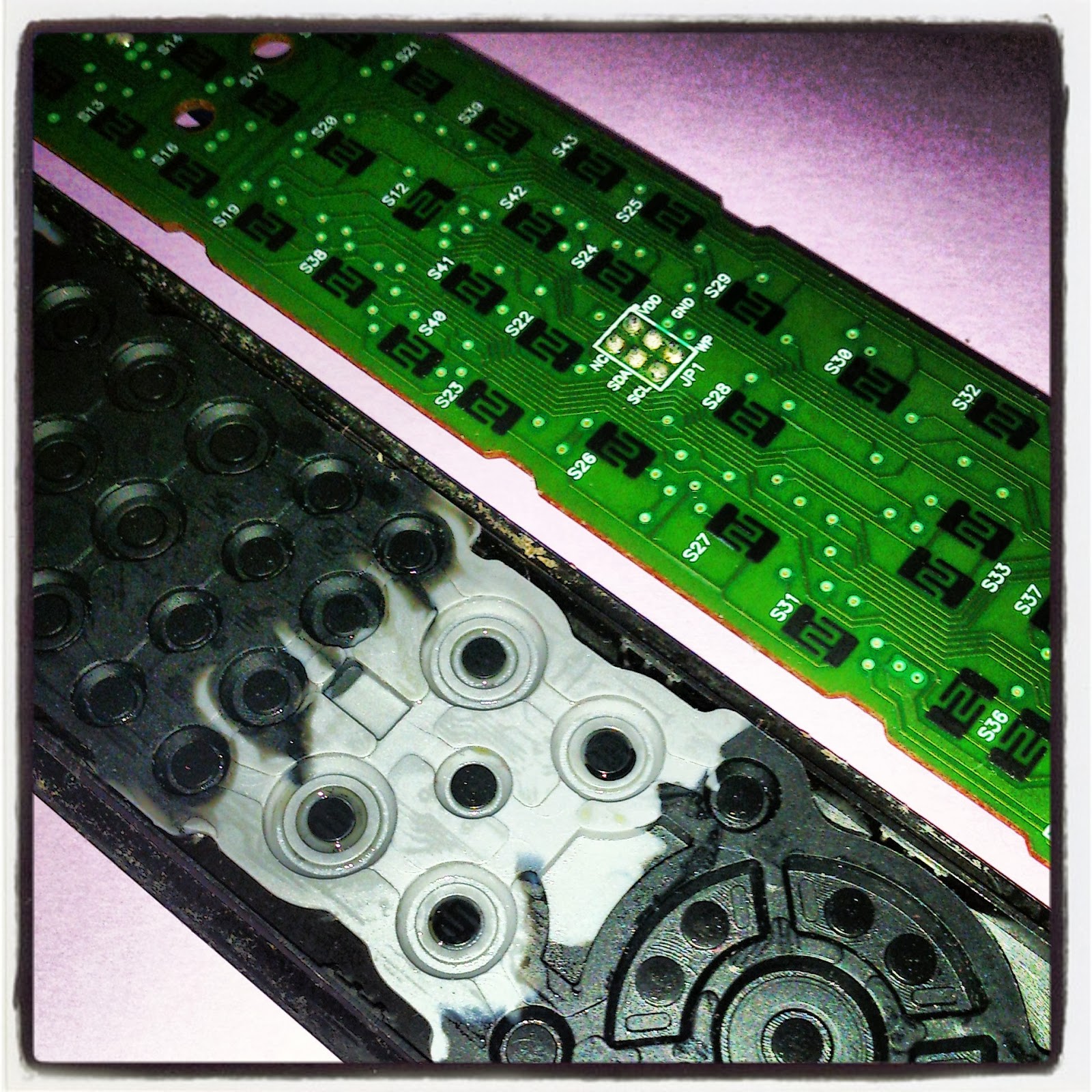 Si separamos la botonera del circuito, veremos que en los botones más usados, existe una pequeña mancha de grasa que es la que evita el correcto contacto entre las dos partes....